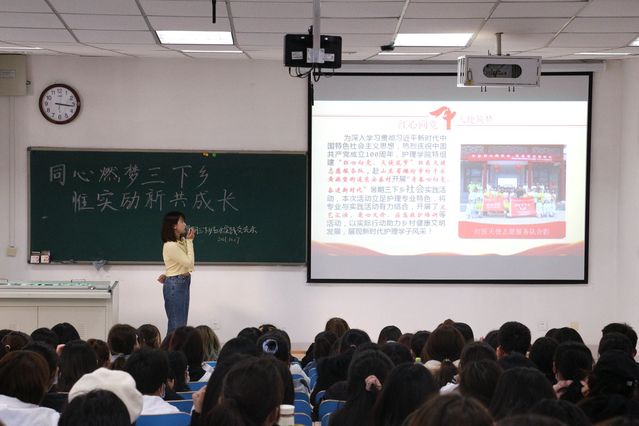 会上,各分队的优秀实践队员代表通过幻灯片、视频等方式讲述各自队伍实践经历,分享自己的收获和成长。其中“红医天使志愿服务队”队伍代表以视频的形式介绍了“爱心义诊”活动,义诊活动共包括“健康体检,膳食提醒,解疑答惑”三个部分,活动中成员们为当地村民提供了热情、专业的服务,用实际行动践行“乐道济世”的校训。“返家乡”实践队伍代表通过讲述家乡日喀则由贫困到富裕,让同学们感受到党的好政策使贫困地区经济迅速增长,生活发生了翻天覆地的改变。最后,实践队成员一一解答了同学们提出的问题,现场氛围轻松愉快。新生们纷纷表示通过此次活动,对“三下乡”暑期社会实践有了全新的认识,同时也对“三下乡”实践活动充满向往。