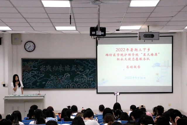 共7支代表队参加了此次交流活动,各代表队优秀队员通过PPT、短视频等形式分享了所在队伍的活动过程及所感所悟。其中,红衣天使志愿服务队介绍了此次实践活动内容,主要包括去潍坊市残联服务中心与残障儿童互动,为望留村民进行爱心义诊、普及急救知识,访问老党员和参观麓台文化博物馆四个方面,在活动中,充分发挥了护理学子的专业优势;党史学习实践团讲述了参观德州党史博物馆的经历,让同学们感受到我国历史文化的博大精深。活动结束后,同学们纷纷表示,通过此次交流会,对“三下乡”实践活动有了更深刻的了解与感悟,今后会积极参加此类活动,展现当代青年的责任与担当。
