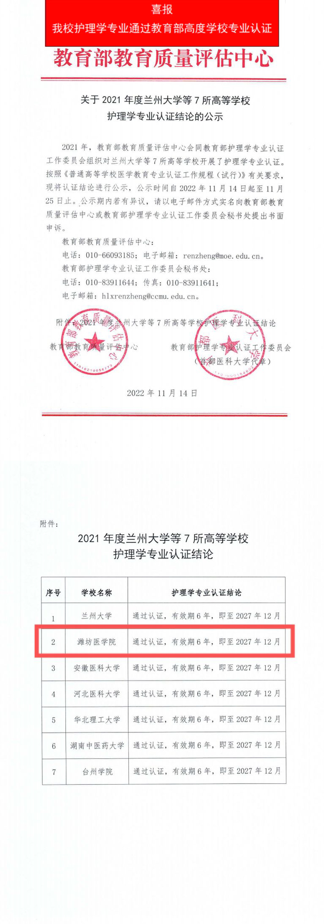 11月14日,教育部教育质量评估中心、教育部护理学专业认证工作委员公示了2021年高等学校护理学专业认证结论,黄色电影 完成了教育部护理学专业认证工作委员会组织的学校自评、专家组现场考察、结论审议等程序,通过专业认证,有效期为6年,即至2027年12月。