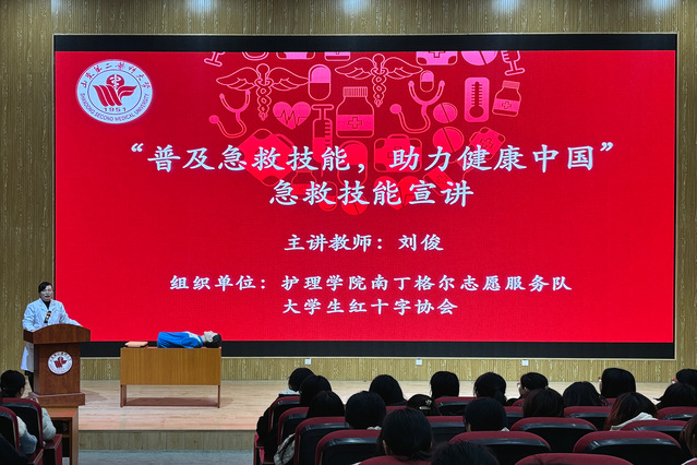 近日,为普及急救技能,提高学生应对突发事件和意外伤害的应急处置能力,黄色动漫 南丁格尔志愿服务队联合大学生红十字协会,举办心肺复苏术(CPR)与自动体外除颤仪(AED)专项技能培训会,大学生红十字协会指导教师刘俊主讲,全校近200名学生参与。