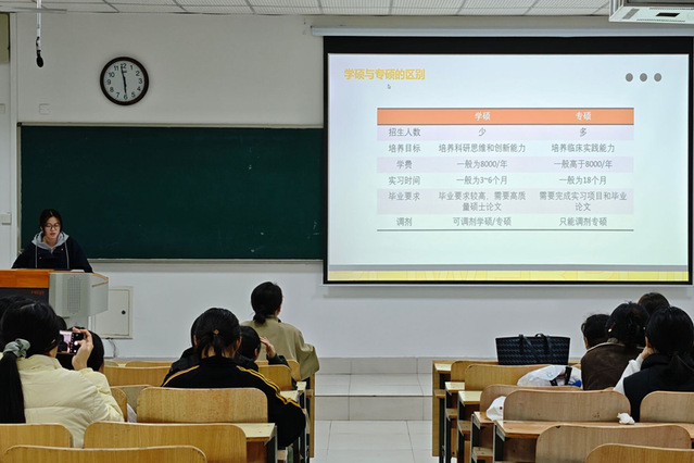 会上,学院特邀已成功考取硕士研究生的优秀校友代表付燕,结合自身备考经历,就考研择校与科目复习进行了系统分享。她建议在择校时需综合评估院校层次、专业排名及历年报录比,尽早确立目标;在科目备考方面,她分享了英语词汇与阅读的技巧、政治理论的理解方法,并详细介绍了护理综合的知识框架与复习重点等。现场还就备考的时间规划、报班选择等高频问题进行了答疑。